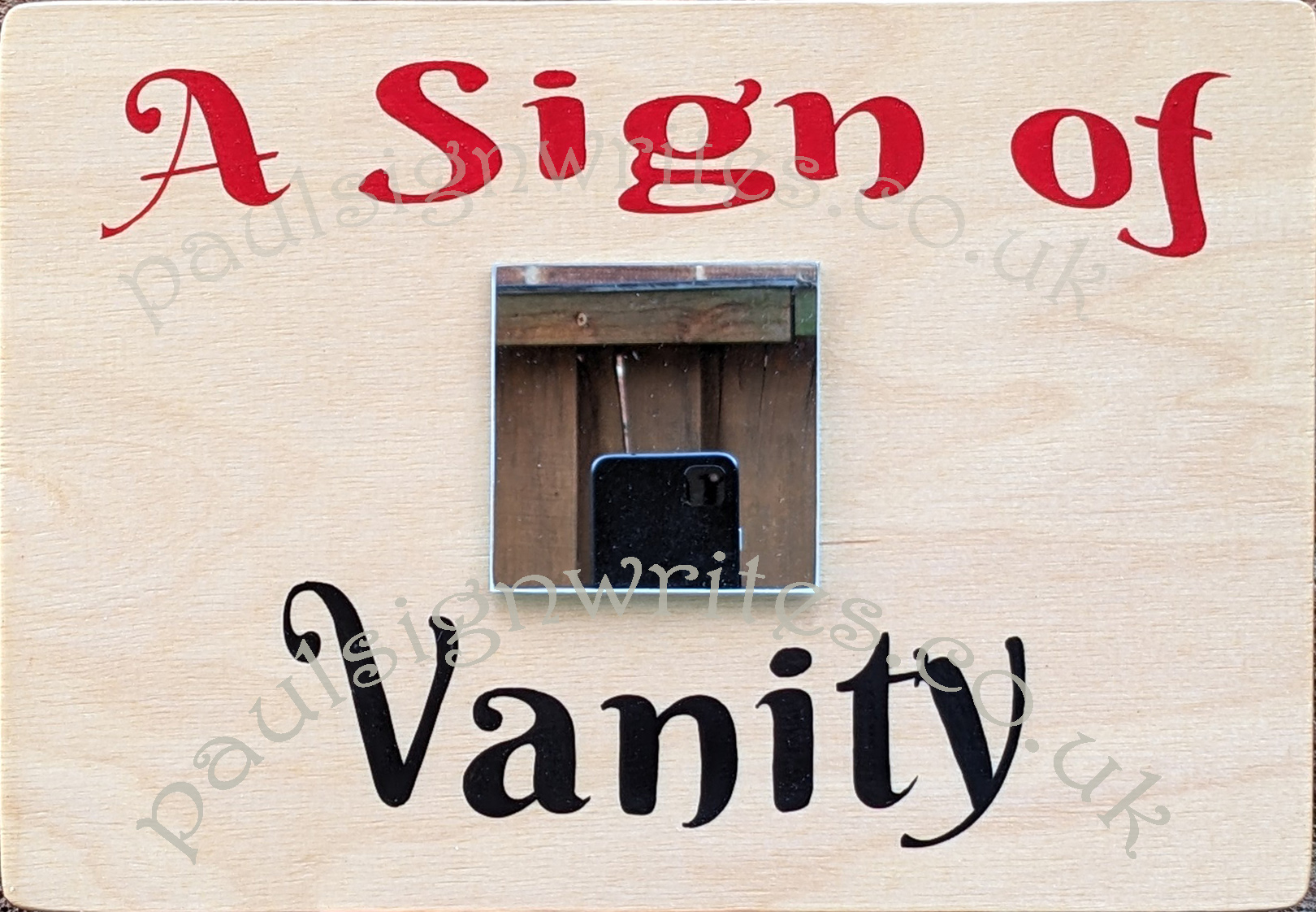 This sign is made of high-quality maple plywood and features a high quality 75mm square mirror glued on its front.