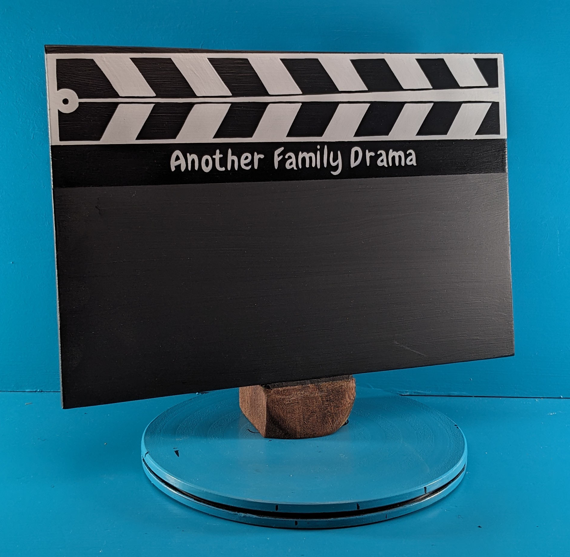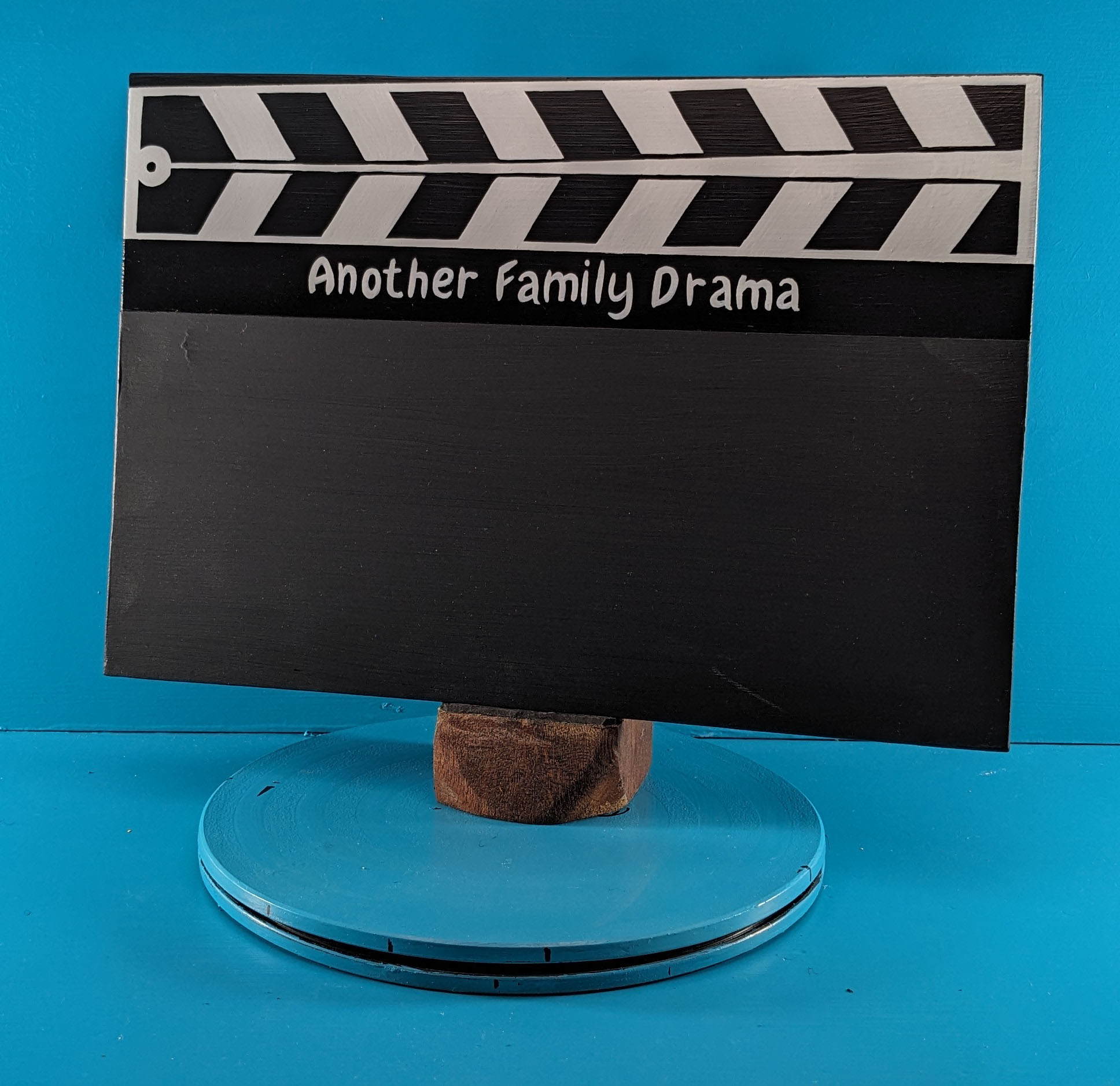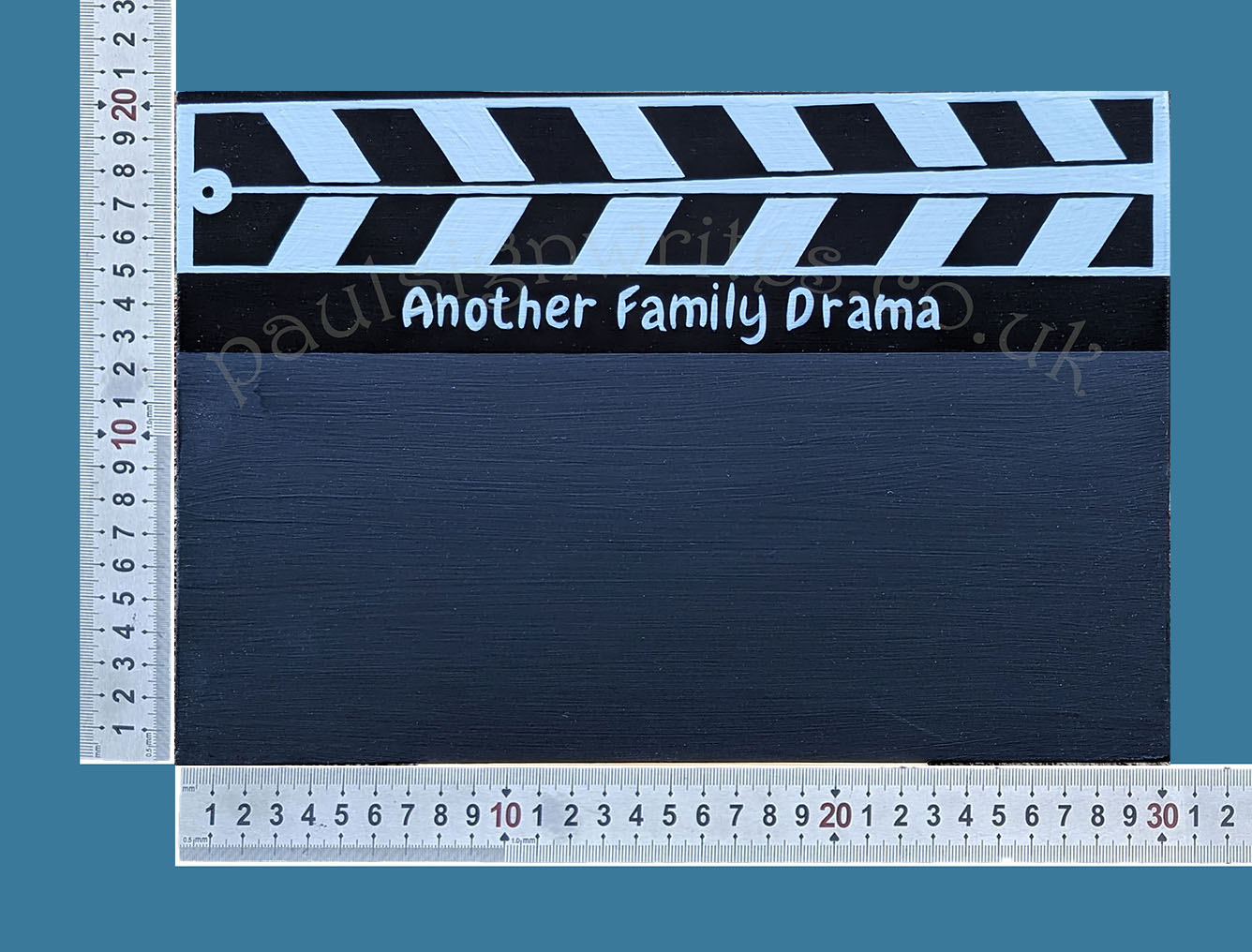 This hand painted film, TV clapperboard themed blackboard, 'Another Family Drama', is a perfect addition to the home. The blackboard has a matt black chalk paint surface, artwork, and white signwritten lettering "Another Family Drama" which adds a subtle sense of humour and irony to this usable blackboard.