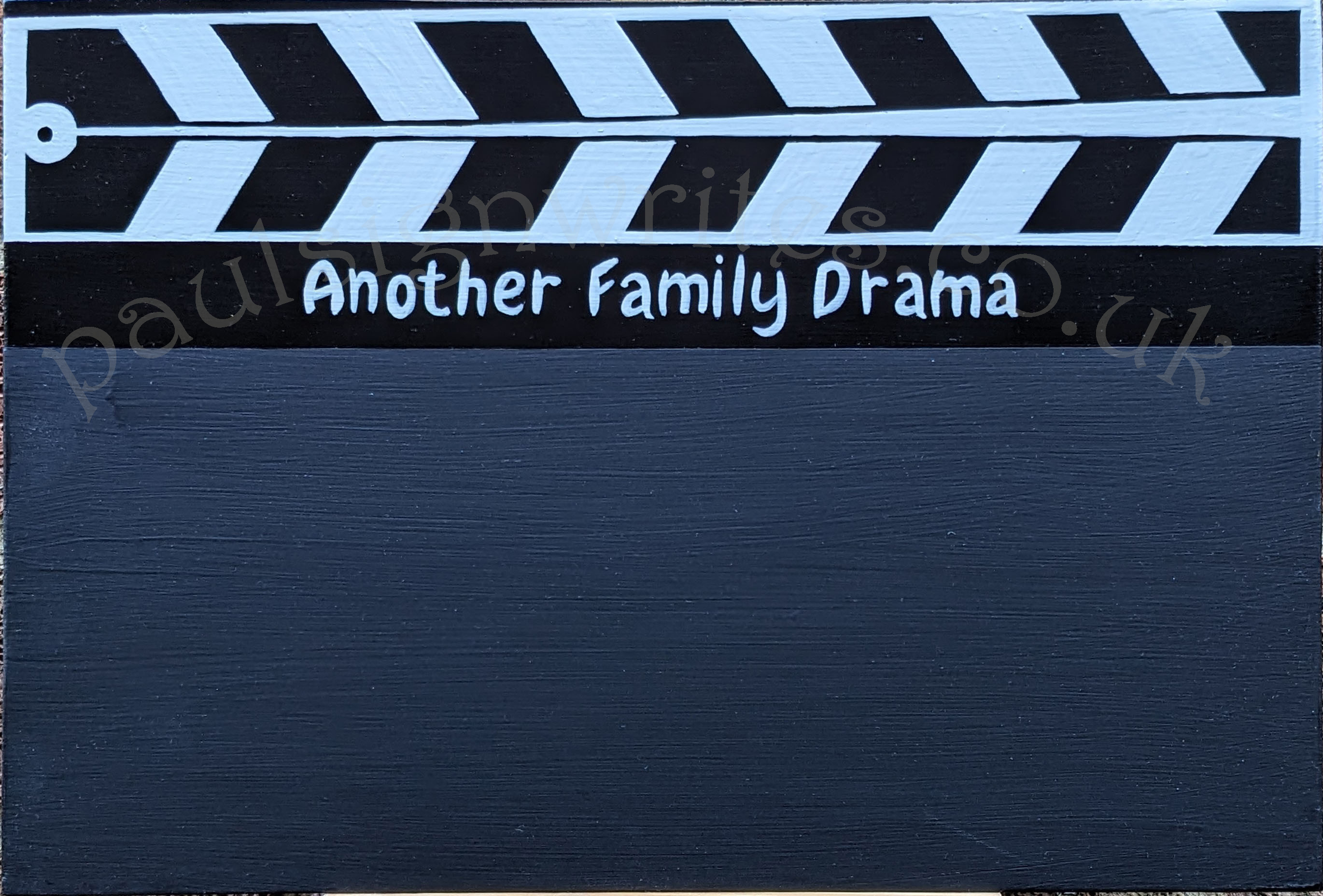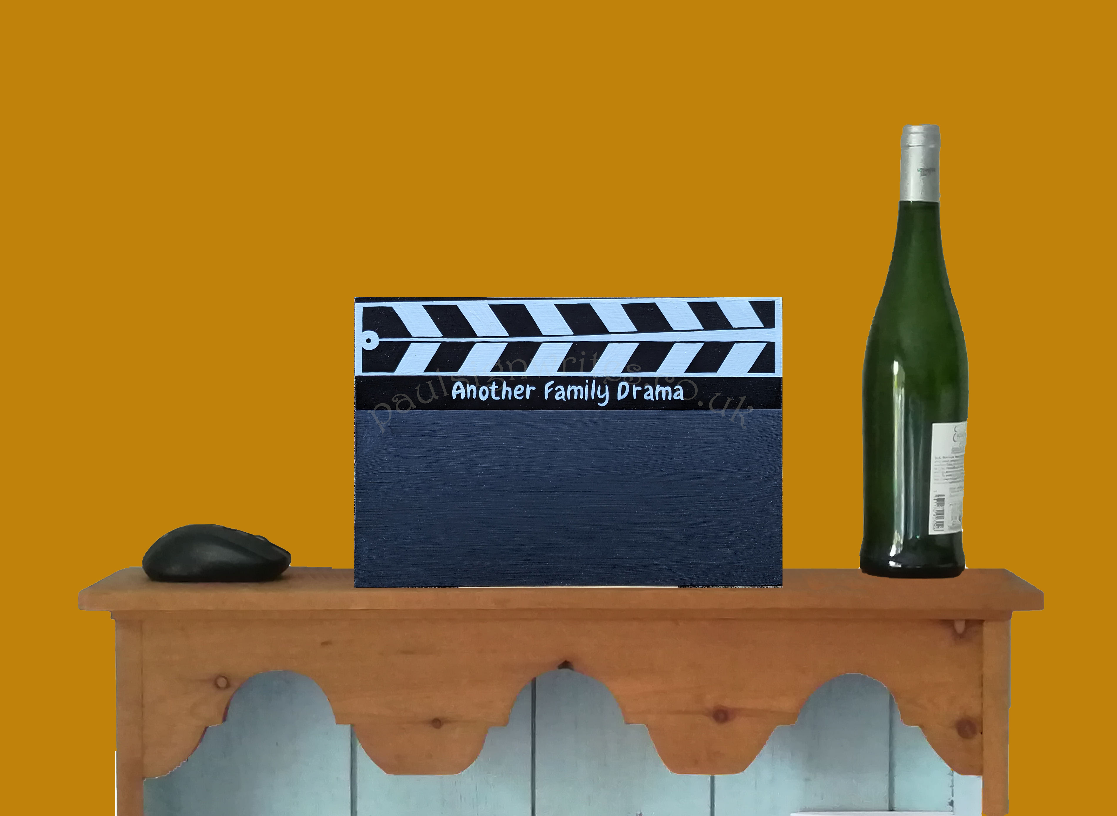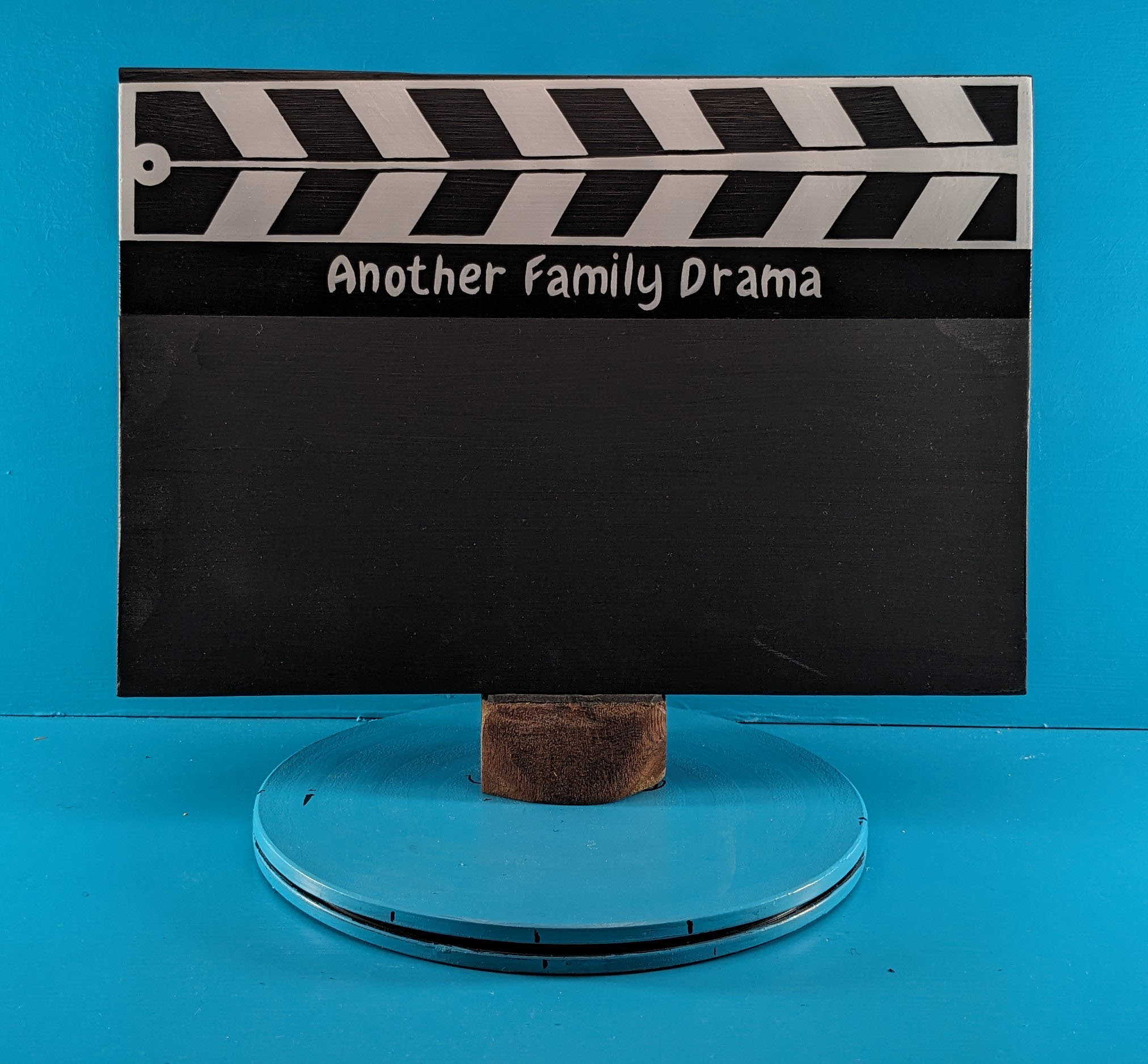 This hand painted film, TV clapperboard themed blackboard, 'Another Family Drama', is a perfect addition to the home. The blackboard has a matt black chalk paint surface, artwork, and white signwritten lettering "Another Family Drama" which adds a subtle sense of humour and irony to this usable blackboard.