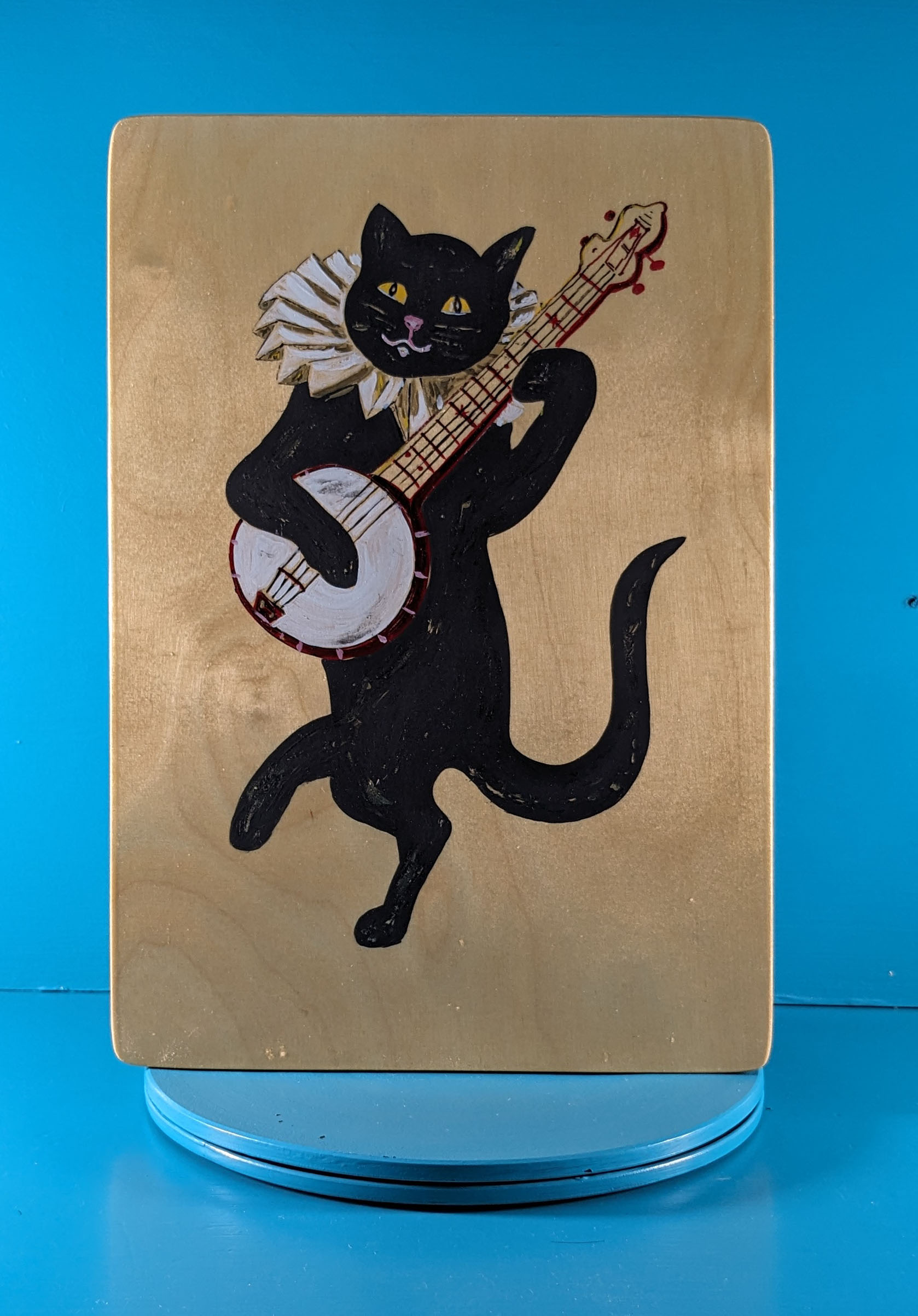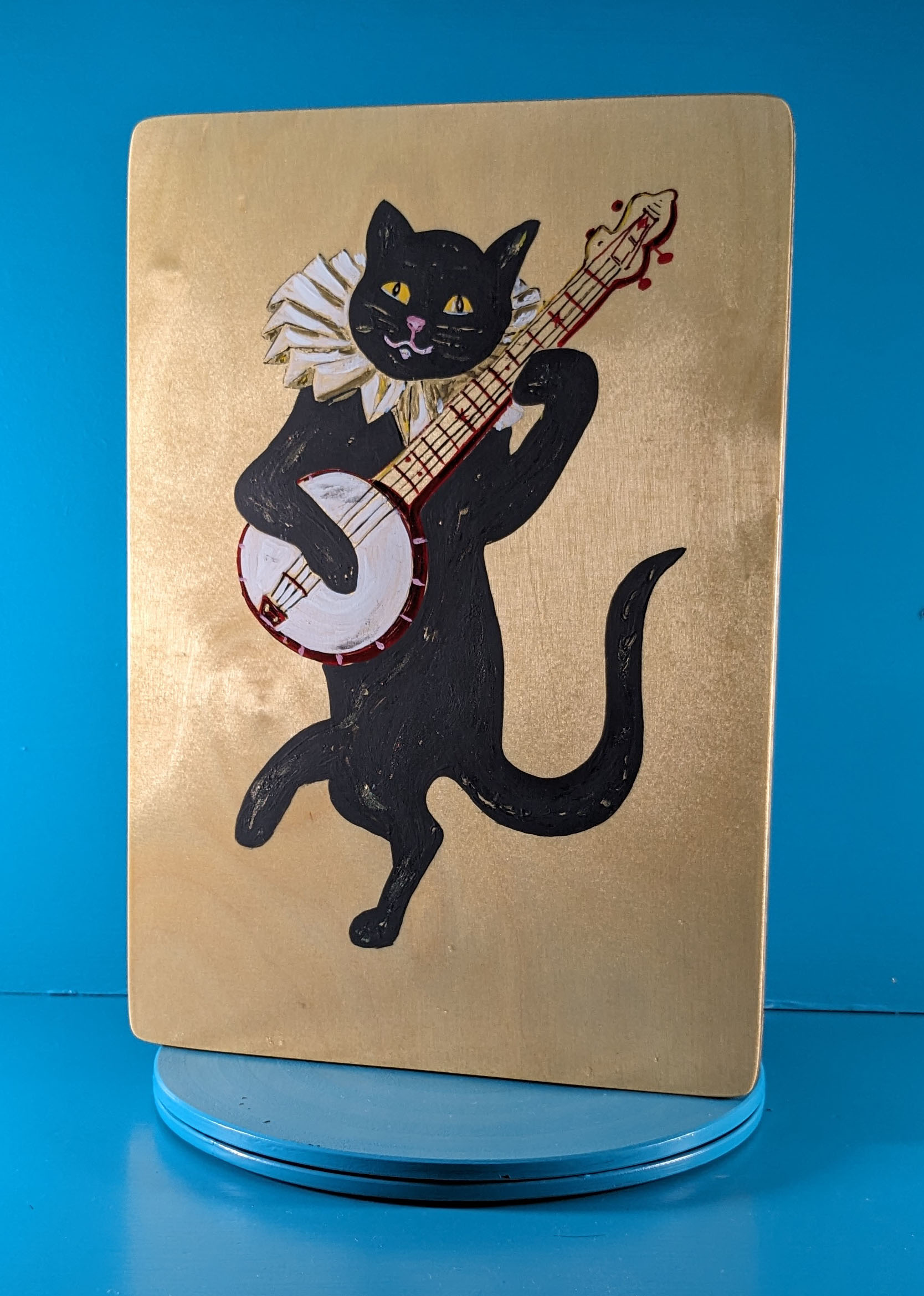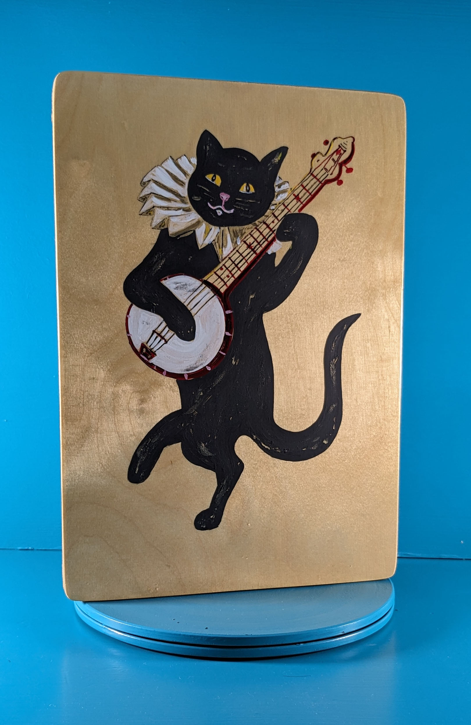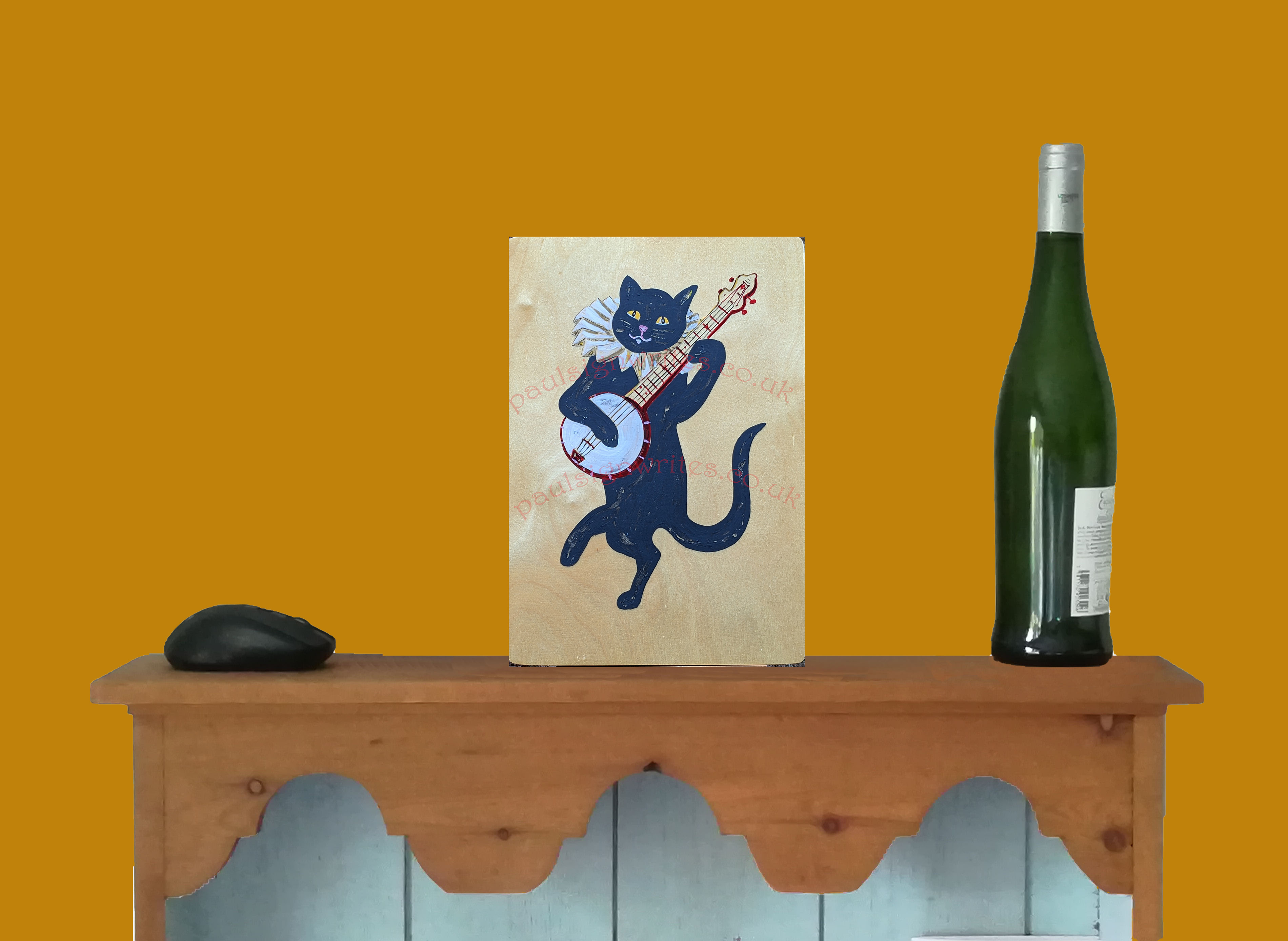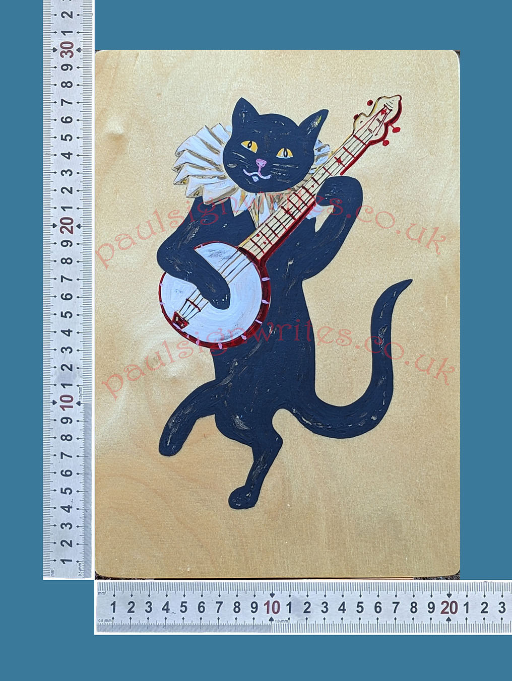 Add a touch of individuality for your home or office with this hand painted cat and banjo sign, this sign is ideal for any cat lover or collector of the quirky. This maple plywood sign measures 30 cm x 21cm in width, making it the perfect size to fit any room. Whether you are into cats or simply appreciate decorative pieces, this sign is sure to add personality to your space.