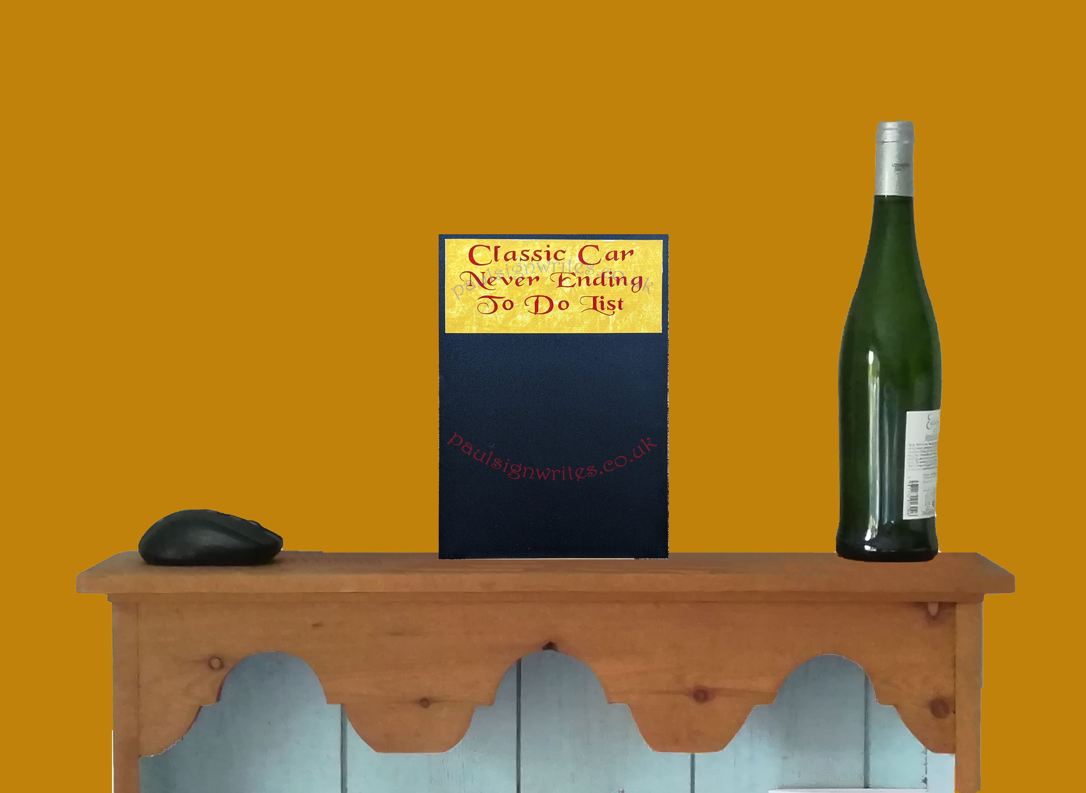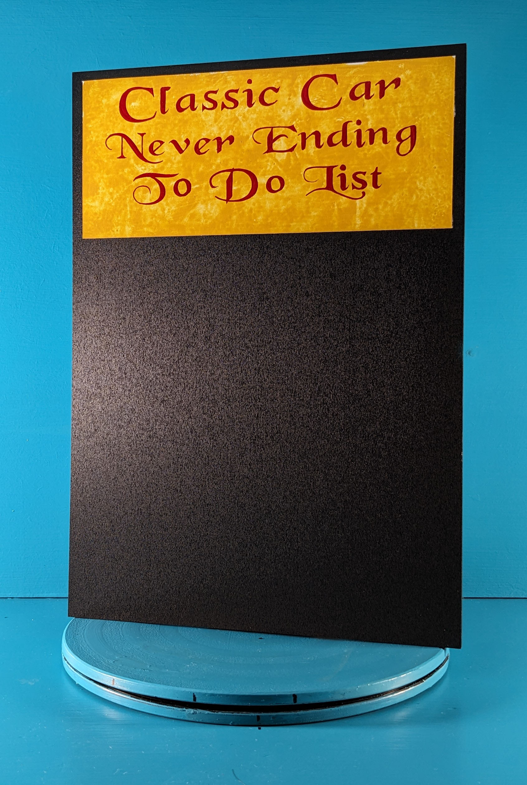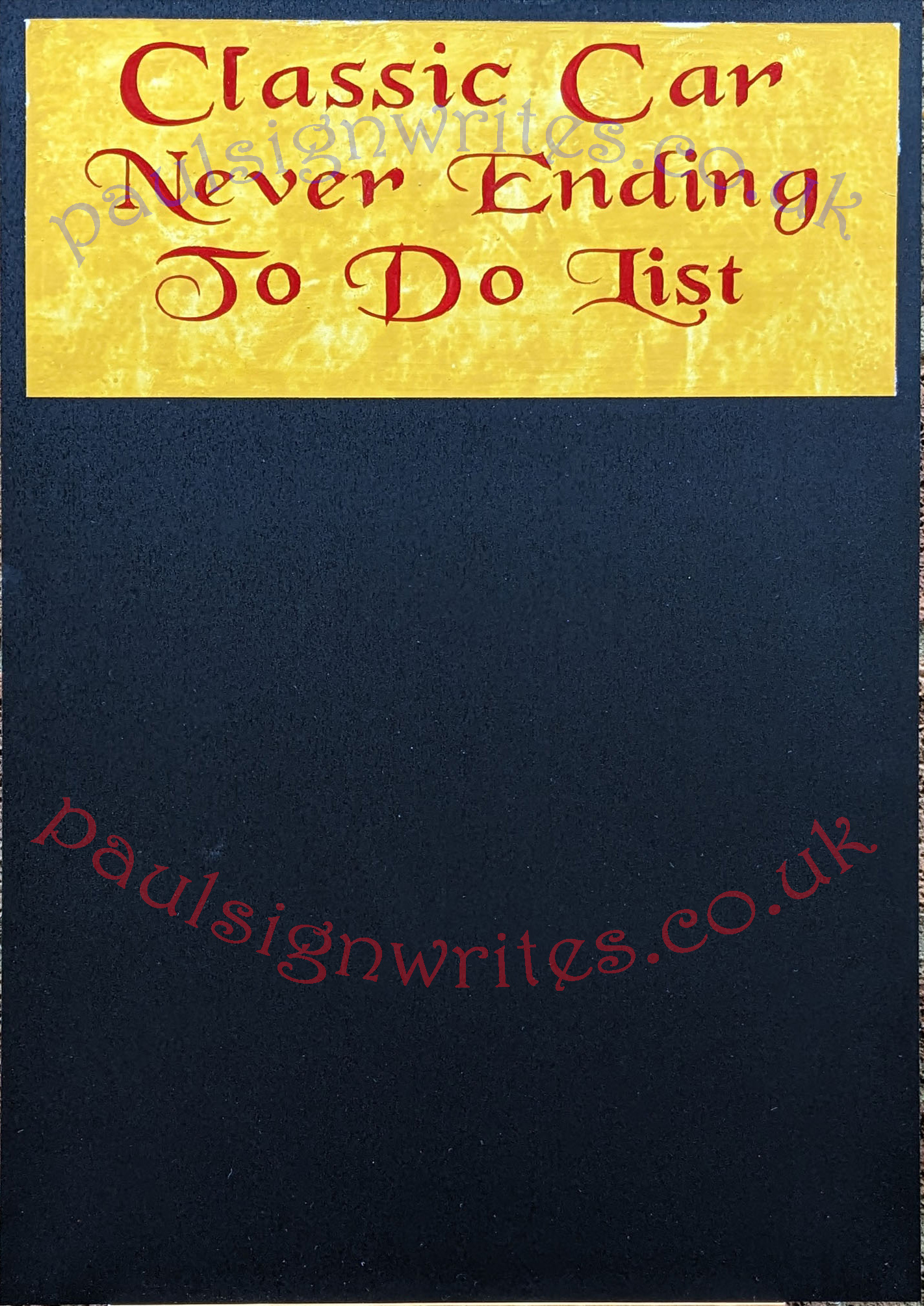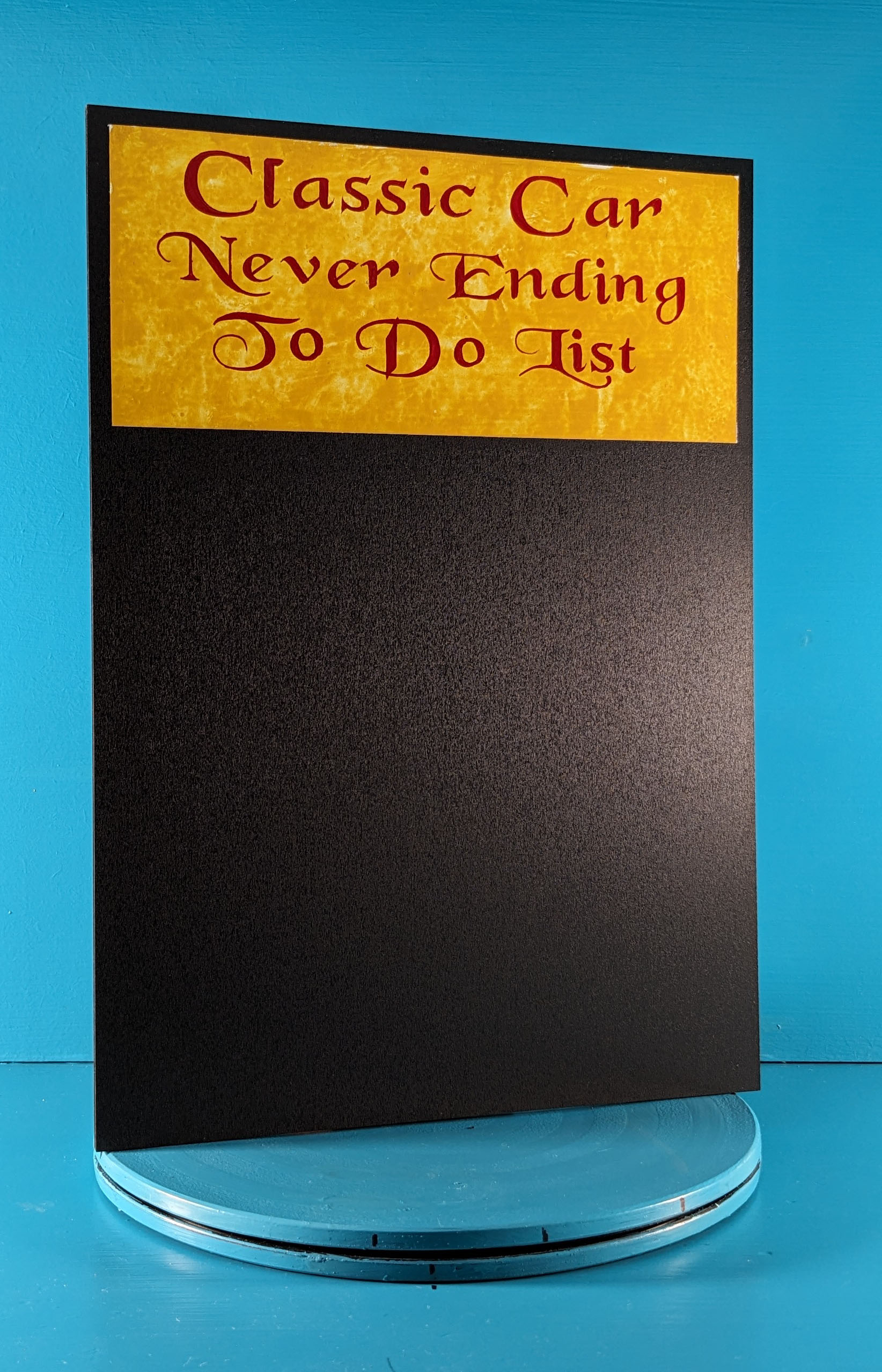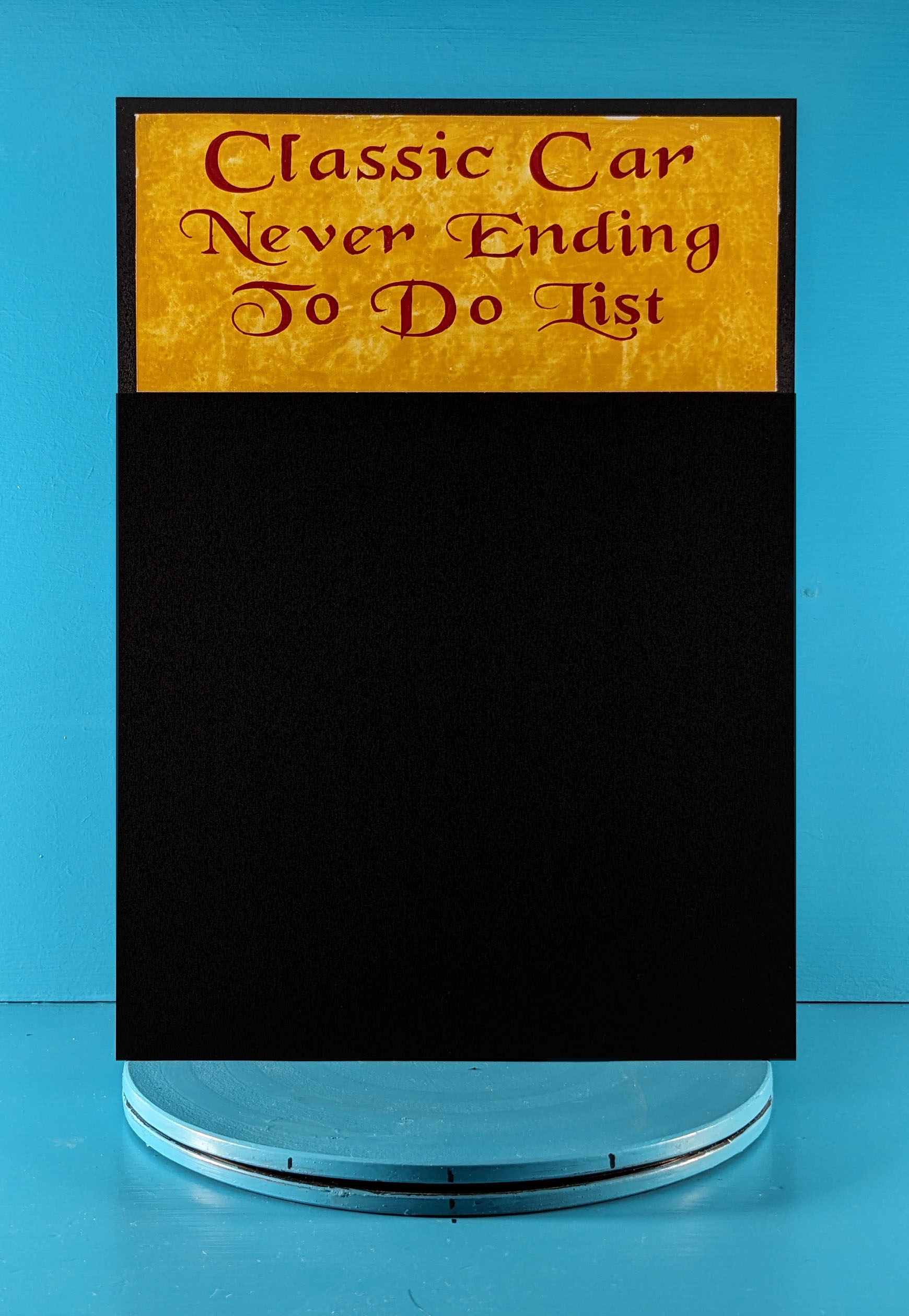 This blackboard, Classic Car, Never Ending To Do List, is a perfect addition to any car enthusiasts home or workshop wall. I purchased the blackboard panel as a finished product as it has an easy clean matt black chalking surface which is suitable for both liquid chalk pens or traditional chalk. I painted the decorative mustard panel and added the red lettering with the signwritten words "Classic Car, Never Ending To Do List". The sign can be either free standing or wall mounted, I can also attach a suede leather string to the top if requested.