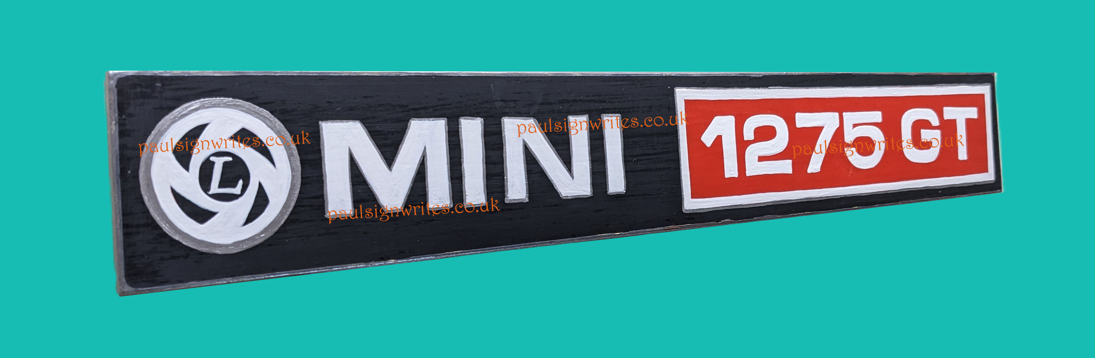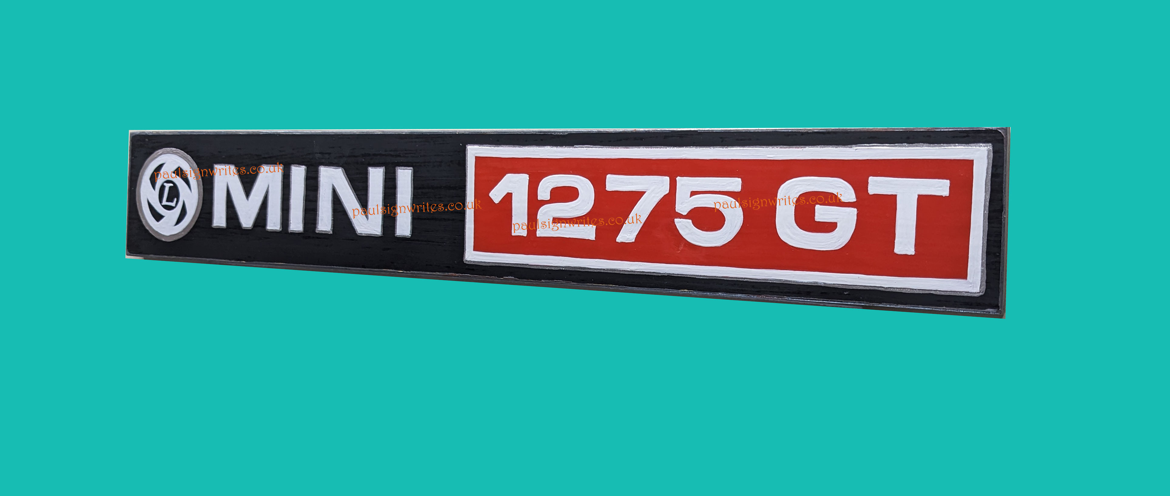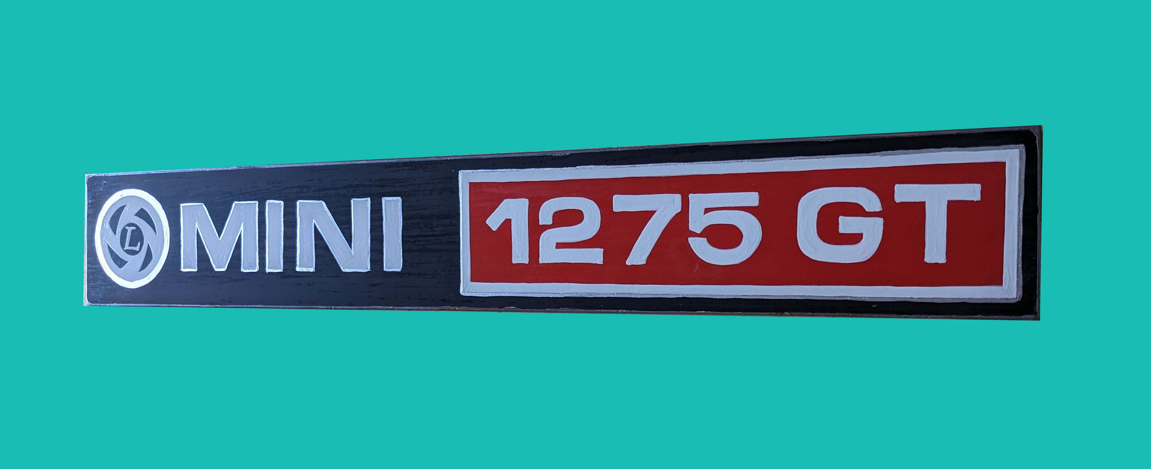 This sign is a reproduction of the classic British Leyland Mini 1275 GT badge. I painted it on 12mm square edge Mdf which I finished in matt Anchor (black) Dixie Belle Mineral Paint, overvarnished then distressed so as to achieve a subtle brushed steel effect, the red panel is also a matt finish. I painted the white lettering and borderline, and silver shadow lines in 1Shot Sign Painters gloss enamel.