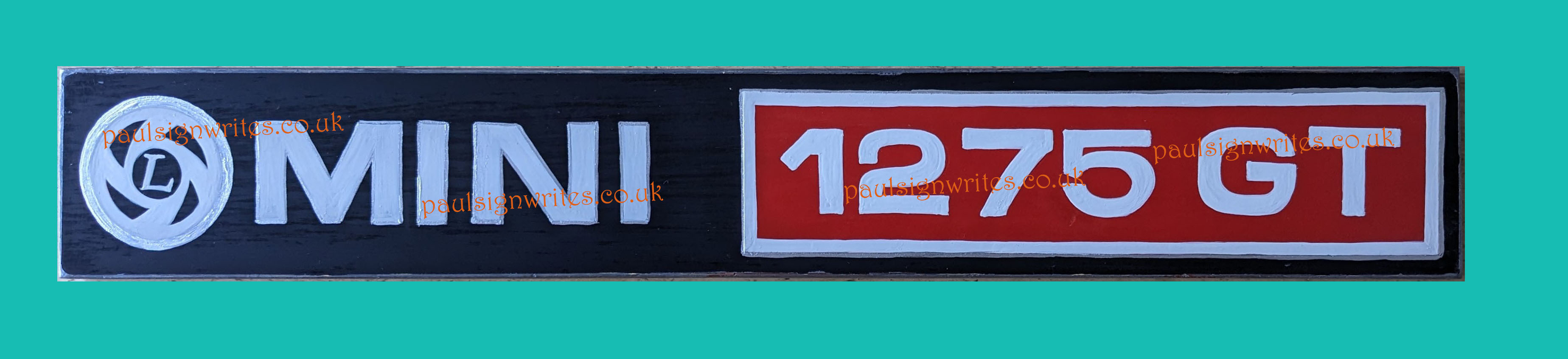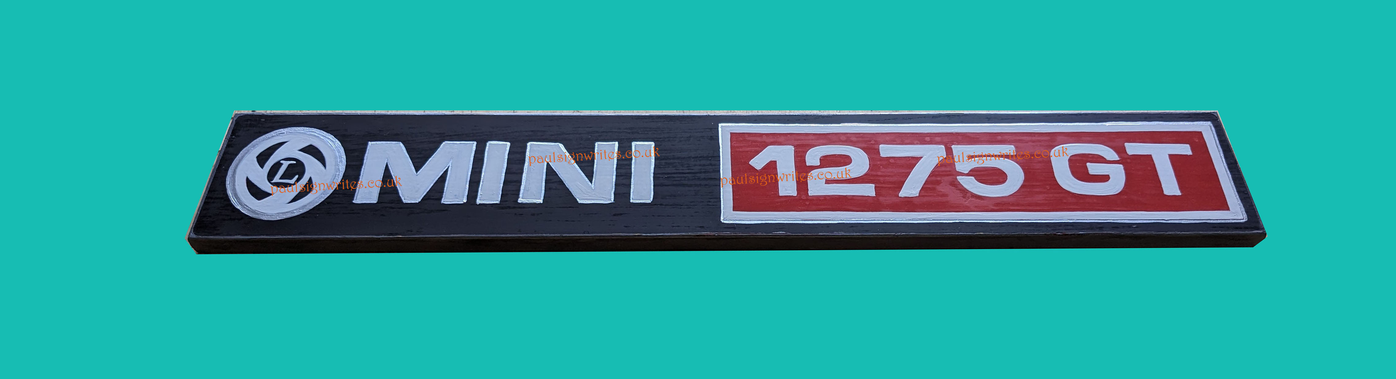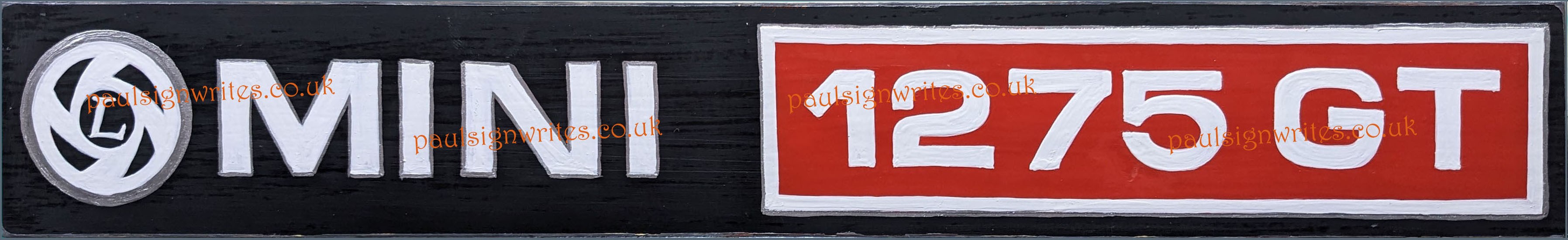 This sign is a reproduction of the classic British Leyland Mini 1275 GT badge. I painted it on 12mm square edge Mdf which I finished in matt Anchor (black) Dixie Belle Mineral Paint, overvarnished then distressed so as to achieve a subtle brushed steel effect, the red panel is also a matt finish. I painted the white lettering and borderline, and silver shadow lines in 1Shot Sign Painters gloss enamel.
