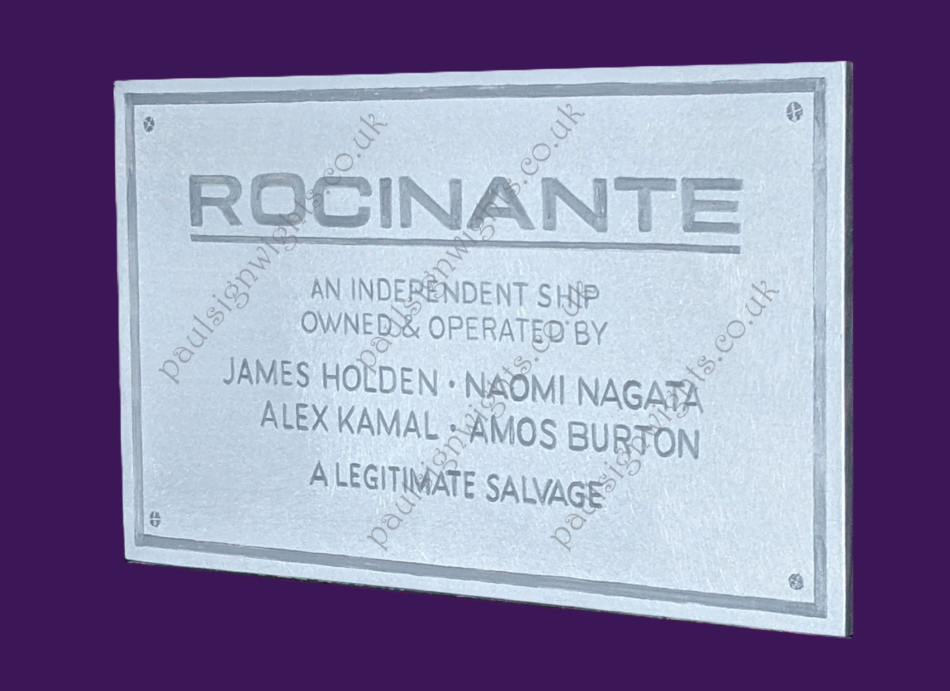 I painted this sign as I am a fan of The Expanse television series. The process involved recreating a aluminium/silver mottled metal finish which both looks realistic but also has texture of metal when touched. I achieved this through various brush techniques and by using Bedec metallic silver Multi Surface Paint. The panel was then overvarnished using Polycrylic Acrylic flat varnish.