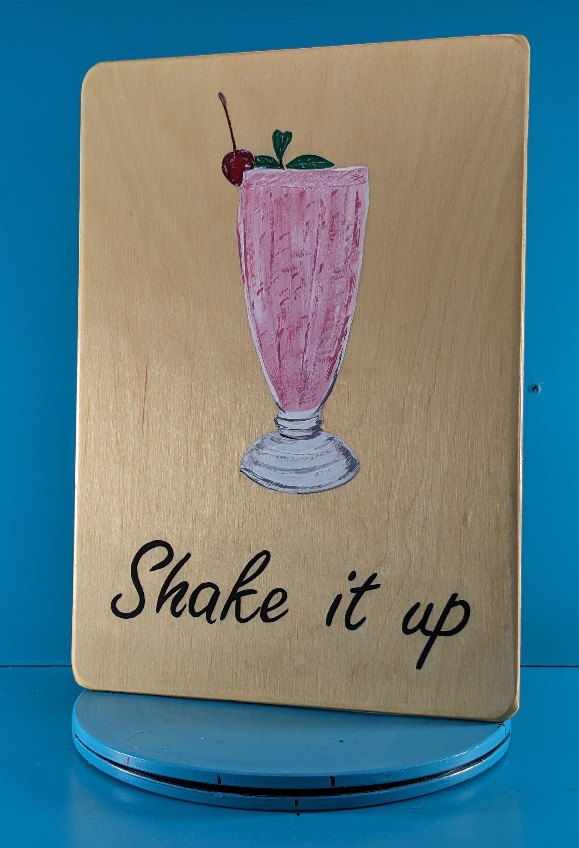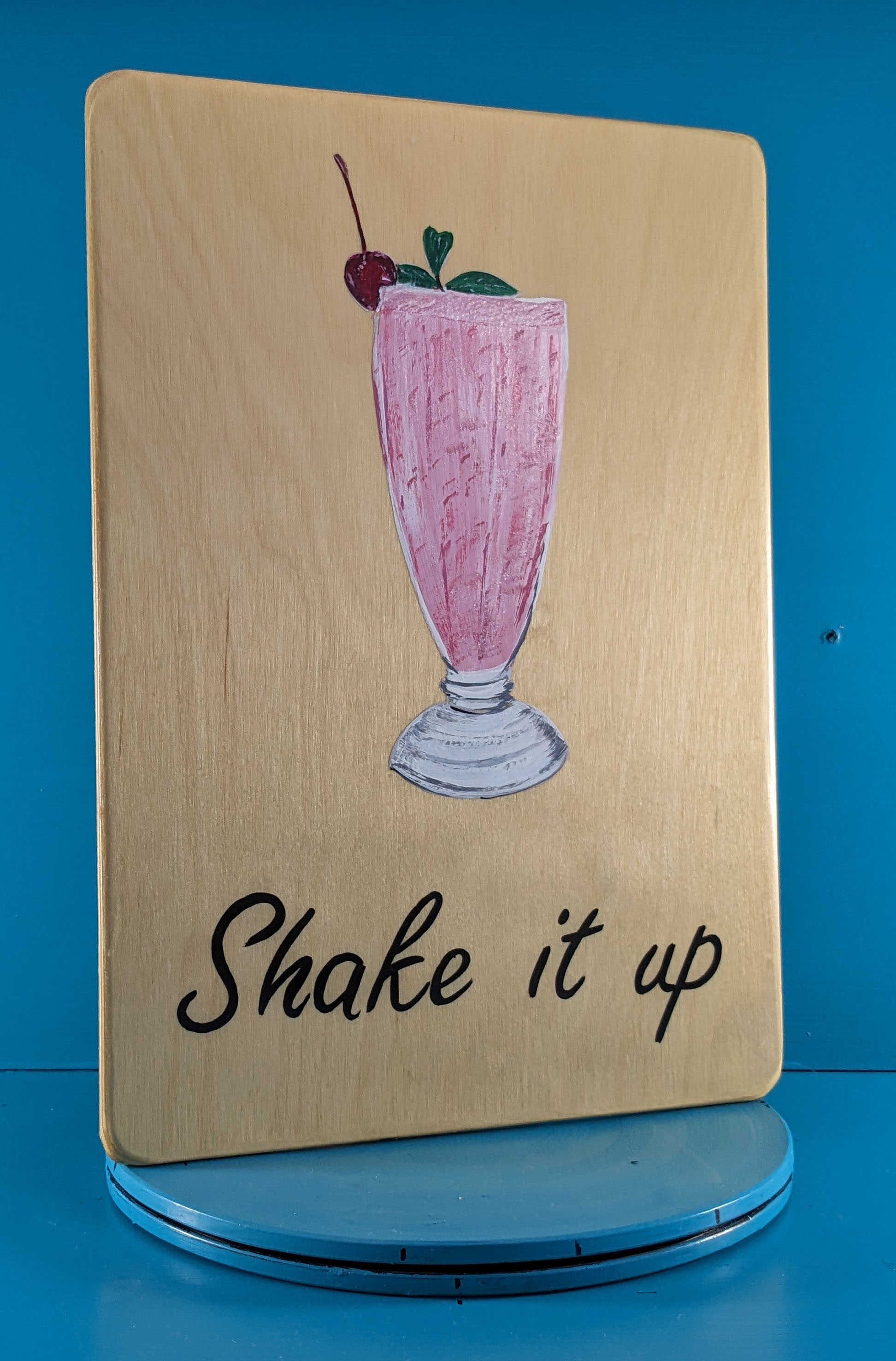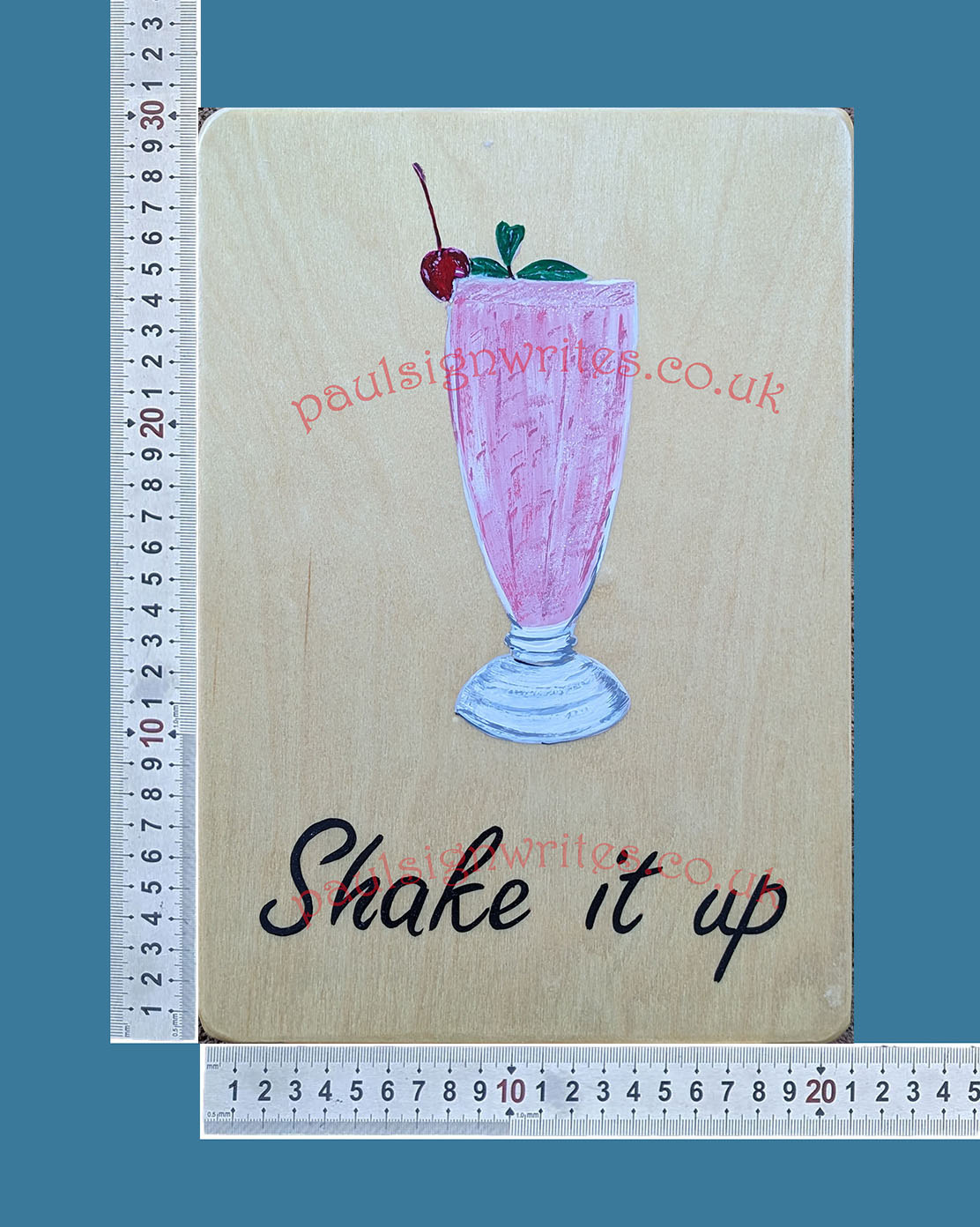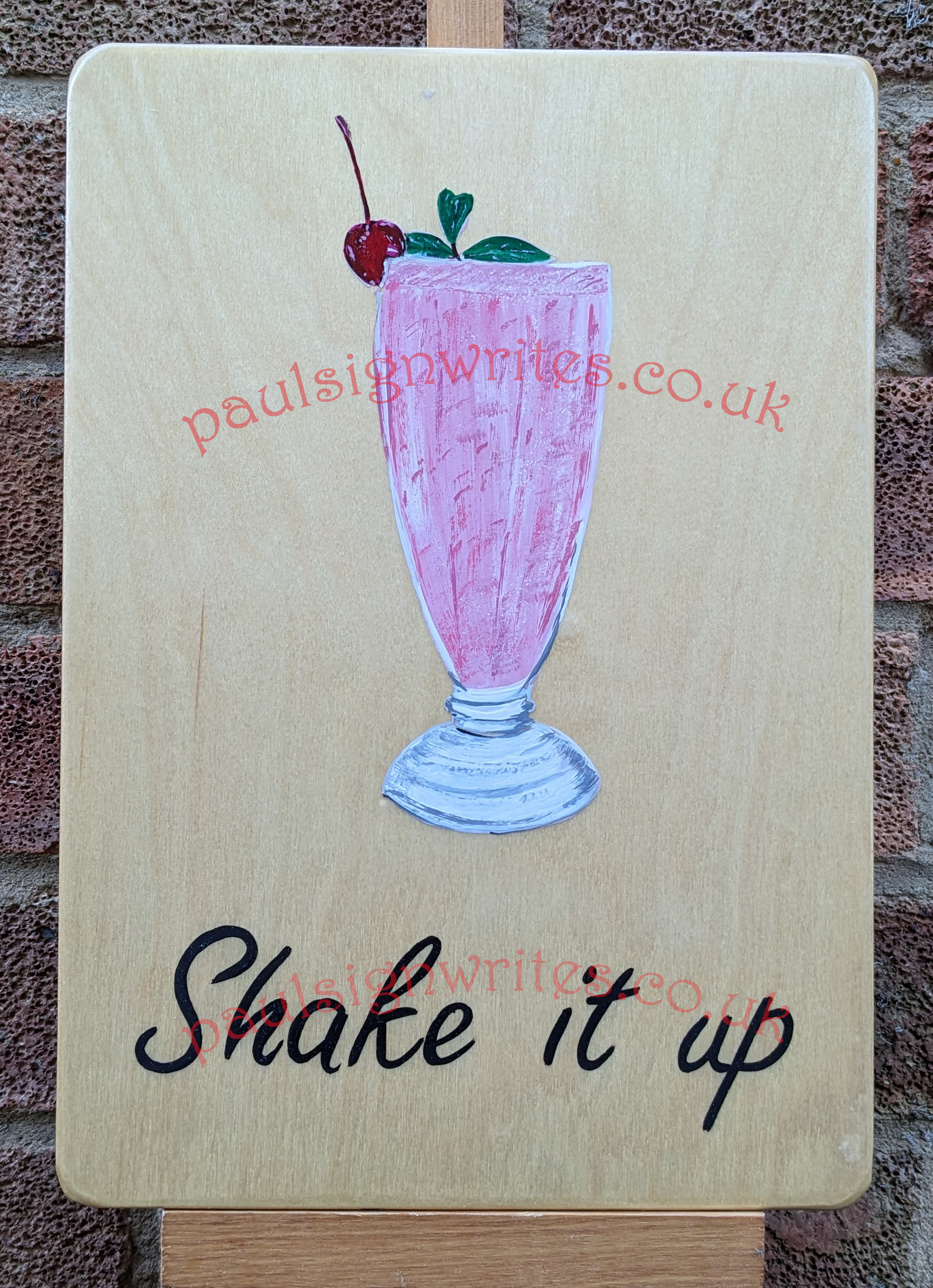 This ‘Shake it up’ strawberry milkshake sign is both tactile and aesthetically attractive and has a touch of the 1960’s café style about it.