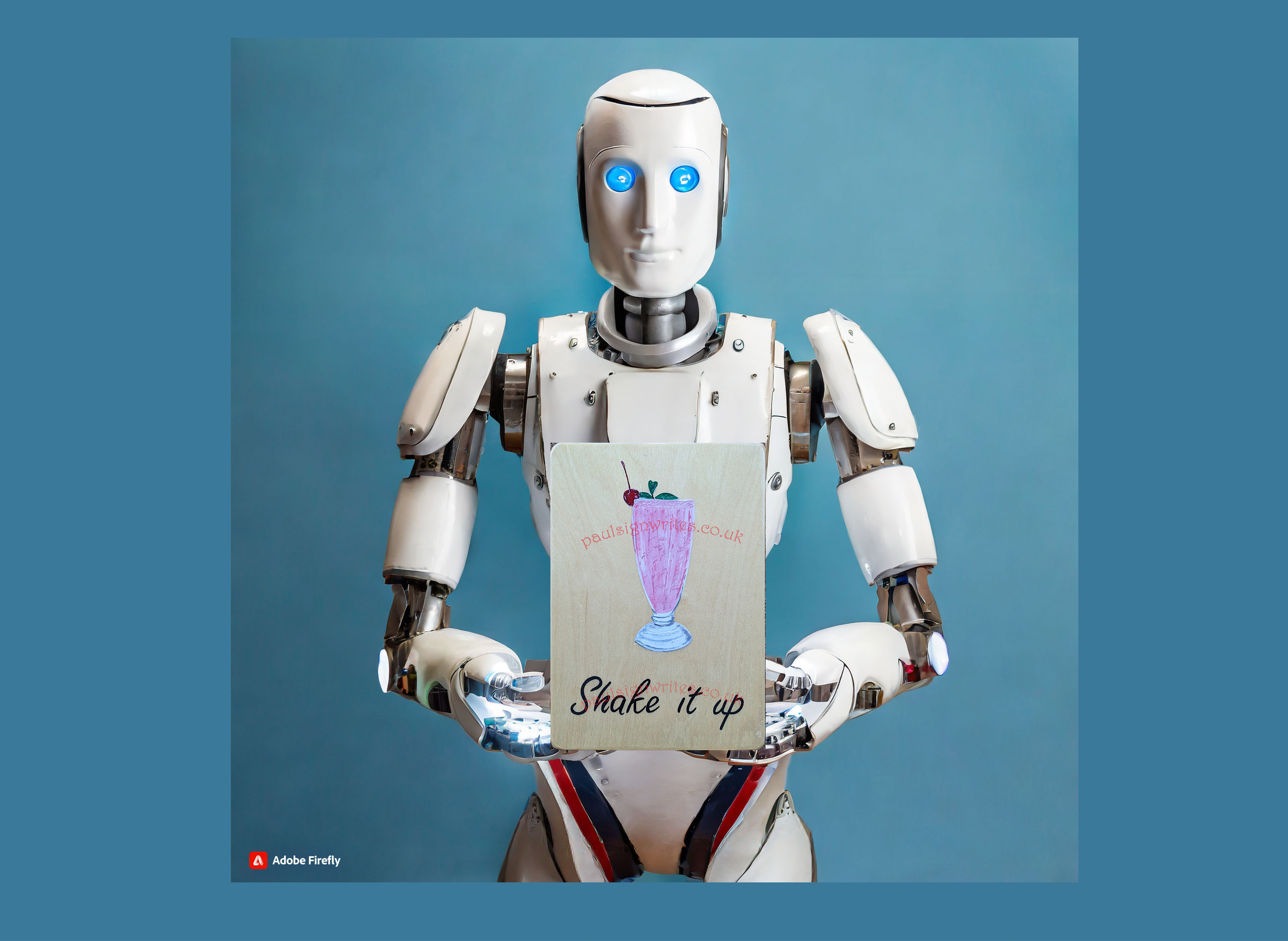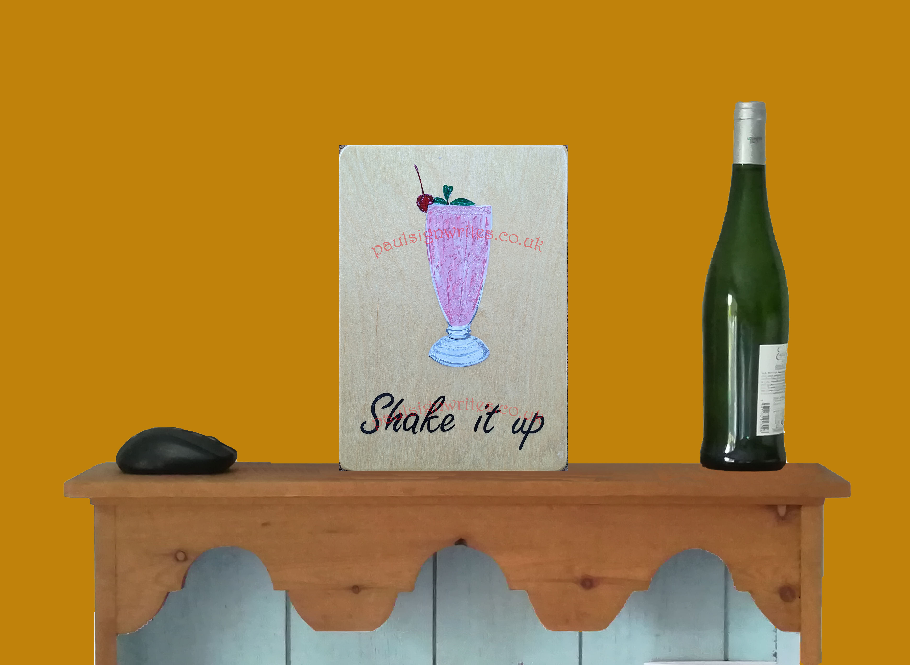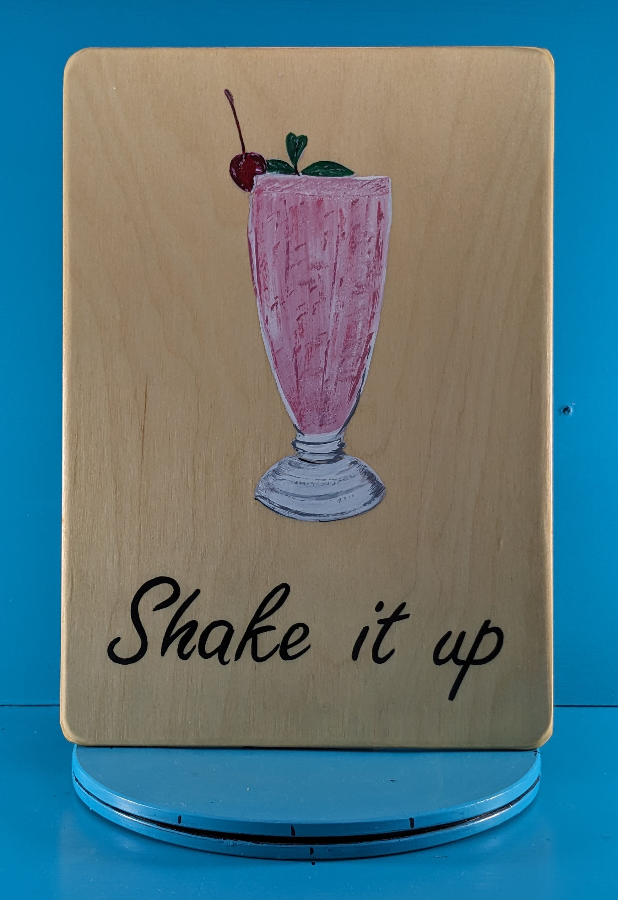 "Shake it up" is signwritten in black italic lettering. The sign design is simple and conveys a sense of fun and enjoyment.