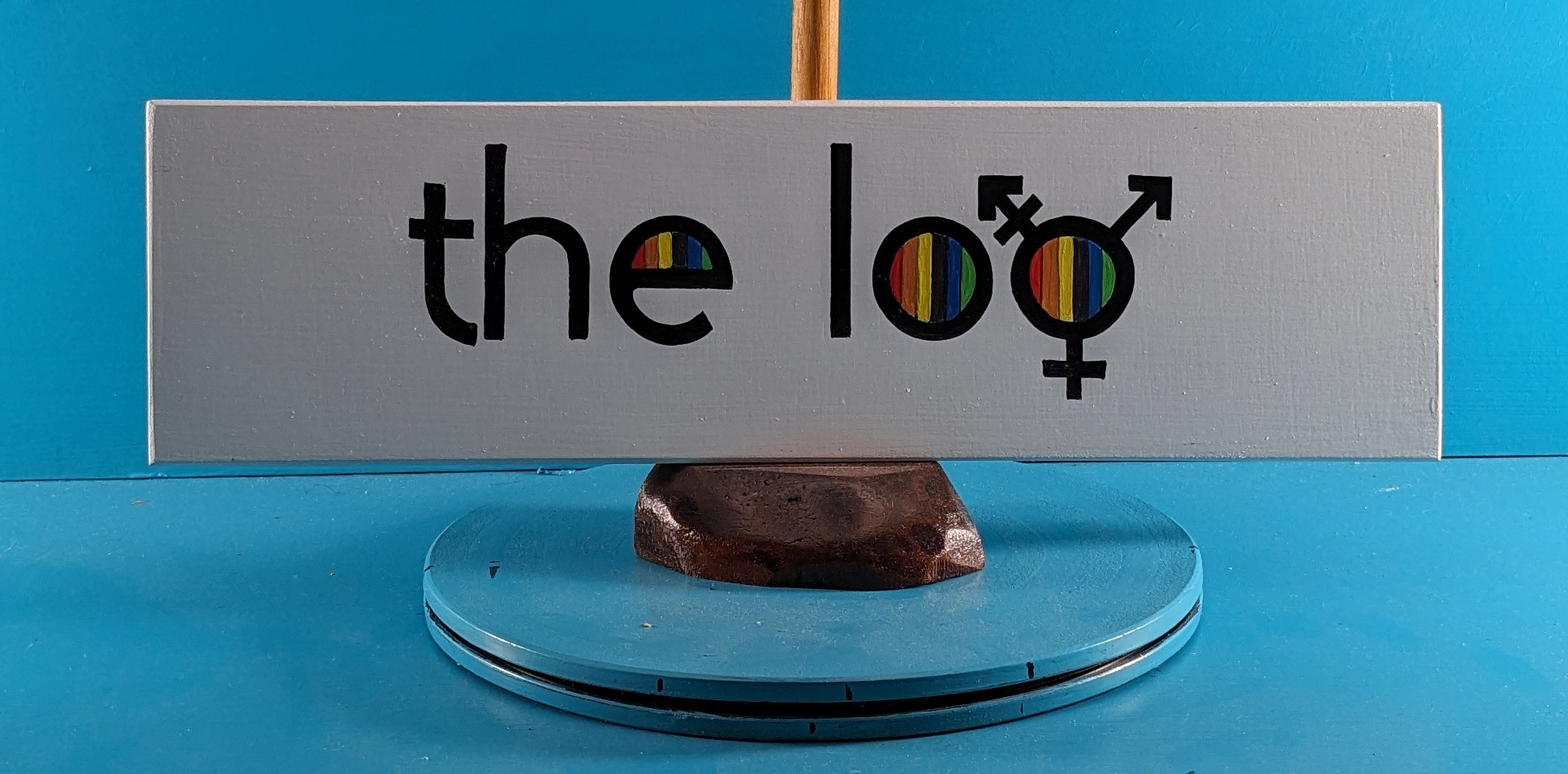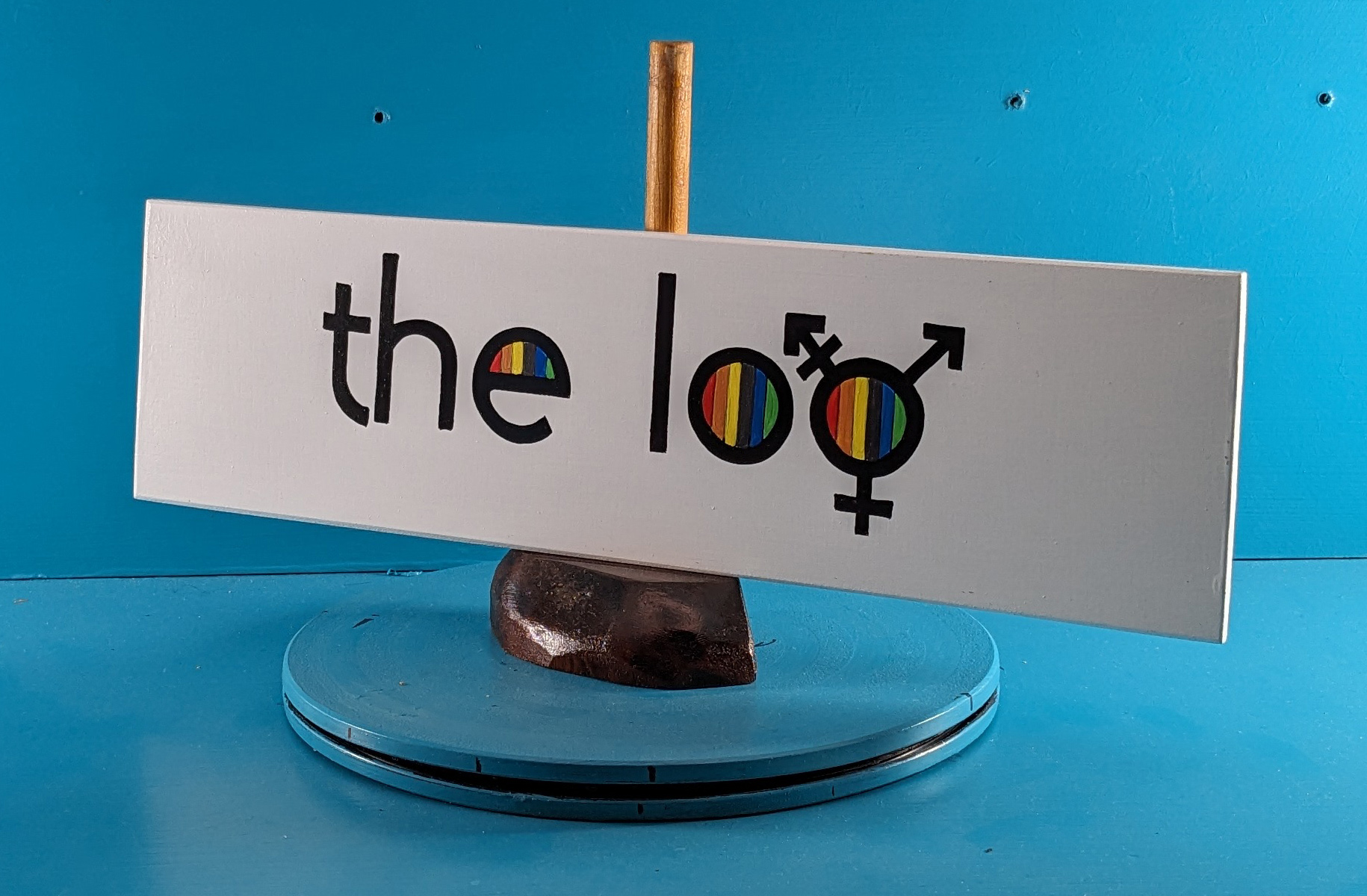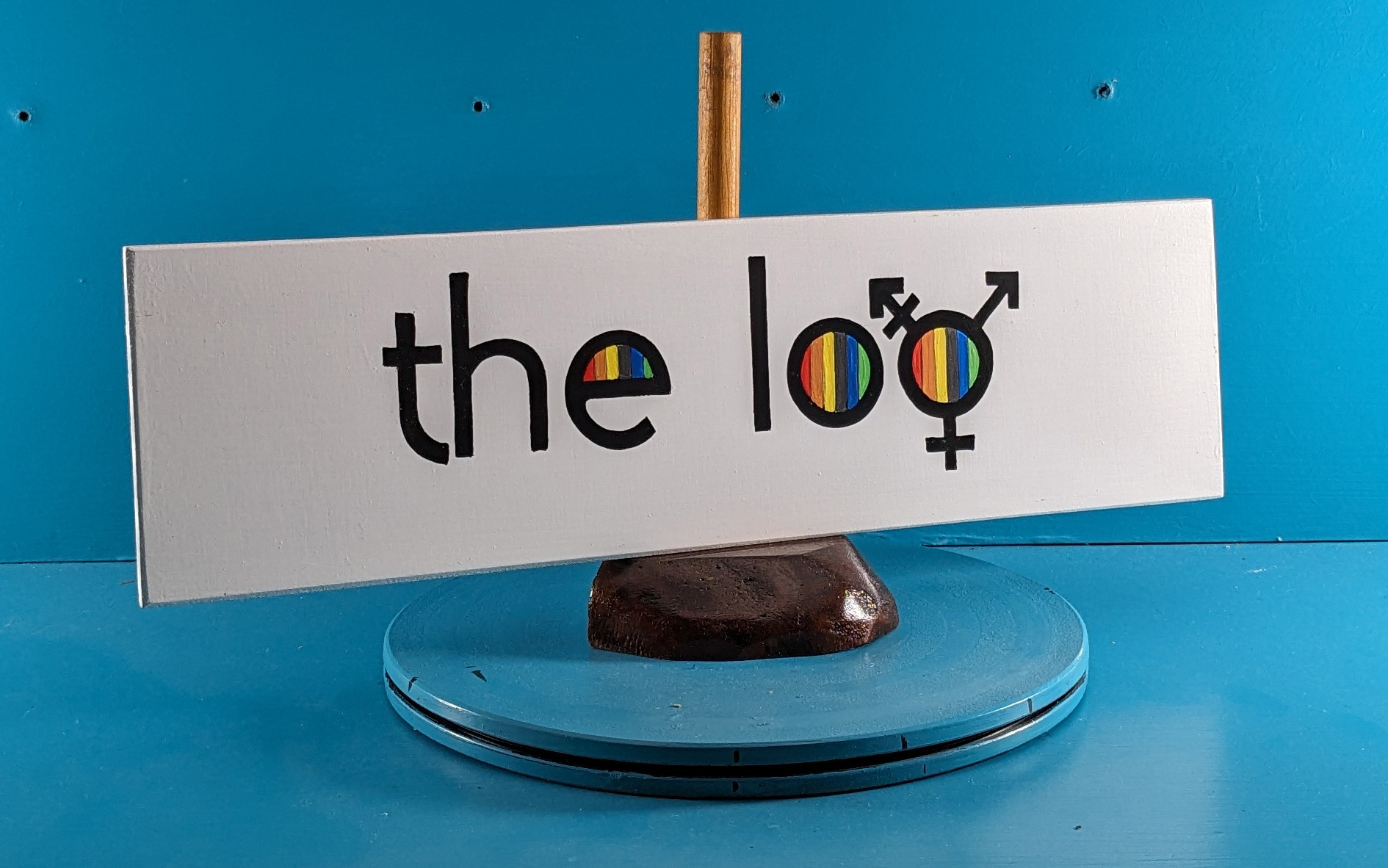This hand-painted sign has a unique and eye-catching artistic design, having sharp lines and integrated rainbow flags.