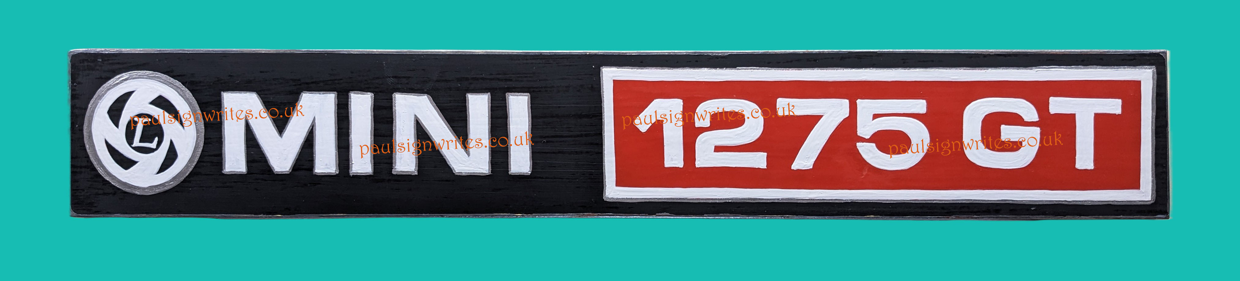 This sign is a reproduction of the classic British Leyland Mini 1275 GT badge. I painted it on 12mm square edge Mdf which I finished in matt Anchor (black) Dixie Belle Mineral Paint, overvarnished then distressed so as to achieve a subtle brushed steel effect, the red panel is also a matt finish. I painted the white lettering and borderline, and silver shadow lines in 1Shot Sign Painters gloss enamel.